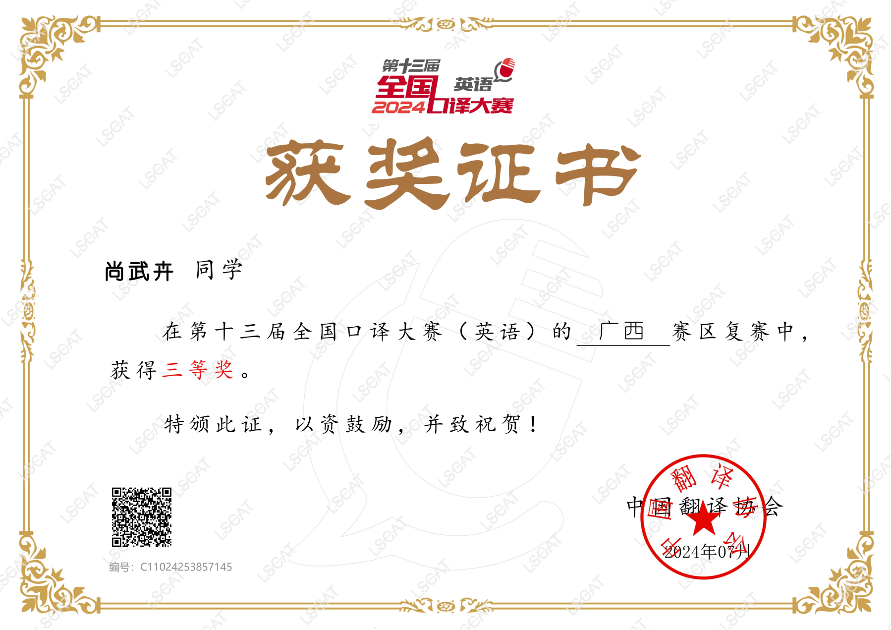 在6月22日至23日通过线上平台成功举行的第十三届全国口译大赛(英语)广西赛区复赛中,南宁师范大学必威西汉姆联官网的学生们以出色的表现取得优异成绩。2020级翻译专业李果芙同学和2022级英语语言文学专业黄雪同学荣获二等奖,2022级英语语言文学专业尚武卉同学荣获三等奖。