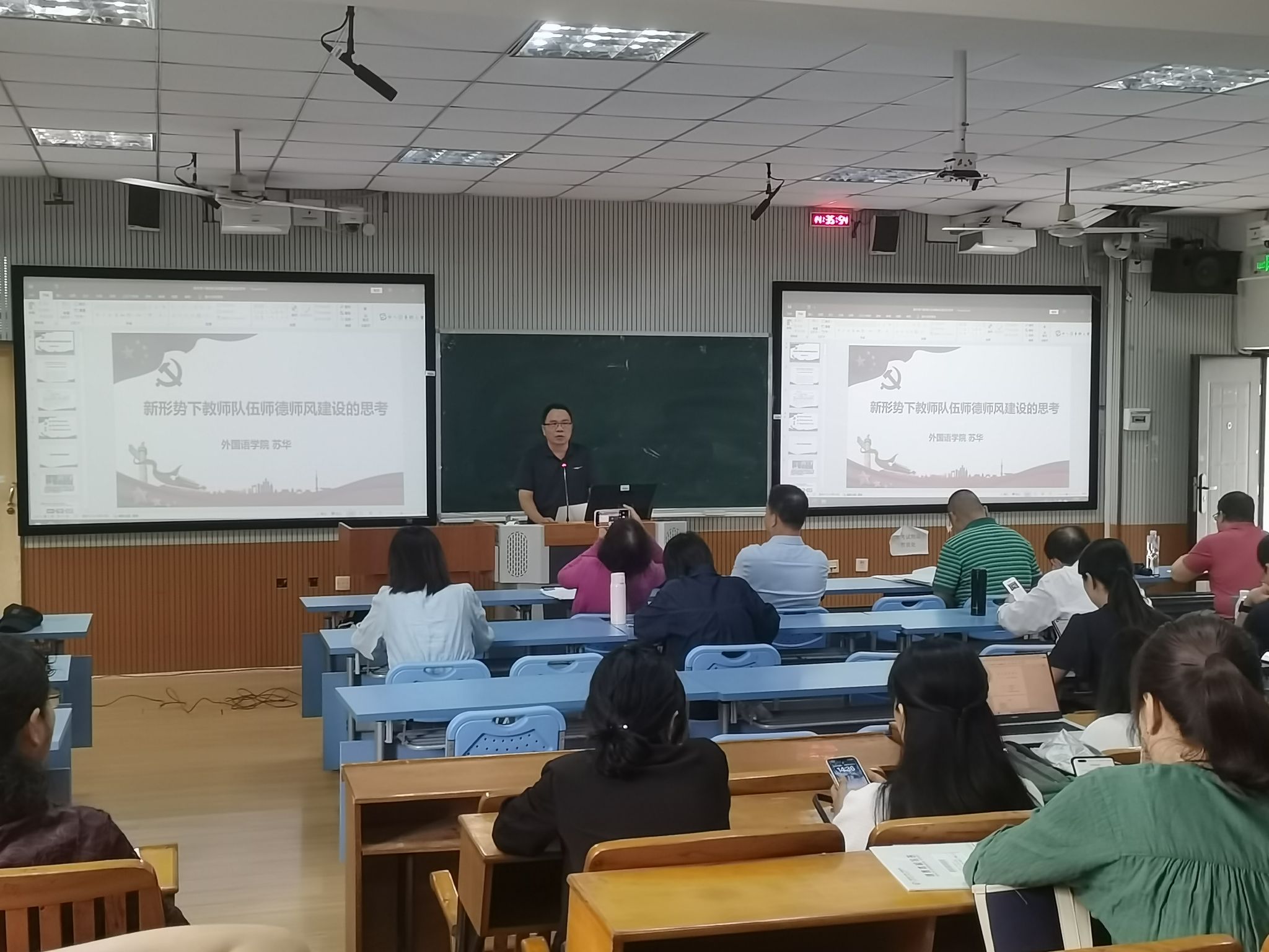 会上,苏华书记以“新形势下教师队伍师德师风建设的思考”为主题作了专题报告,首先传达学习习近平总书记在党的二十届三中全会以及全国教育大会上的重要讲话精神,随后从新时代新征程党的使命任务的战略高度深入解读了新形势下的教育发展趋势,引导全体教师深刻领悟高校教师队伍师德师风建设在建设教育强国中的重大意义。报告对多起违反教师职业行为的典型案例进行深入剖析,强调全体教职工要以案为鉴,严守师德师风底线,持续提升师德素养。