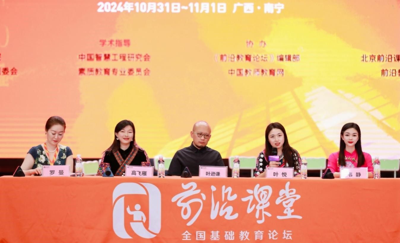课后,南宁师范大学必威西汉姆联官网教育戏剧团队高飞雁、叶悦、基地学校南宁市华衡小学科研主任韦静老师以及喜马拉雅教育戏剧研究院院长、中国戏剧文学学会戏剧教育专业委员会主任委员、导演、戏剧教育专家叶逊谦老师共同参与了“前沿课堂”基础教育论坛主席、前沿教育科学研究院院长罗曼主持问课评课、专题指导活动,解答现场观众提出的问题。