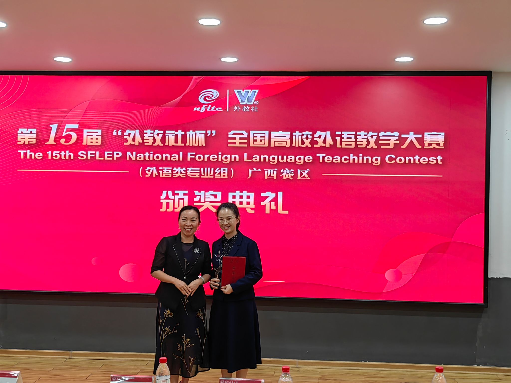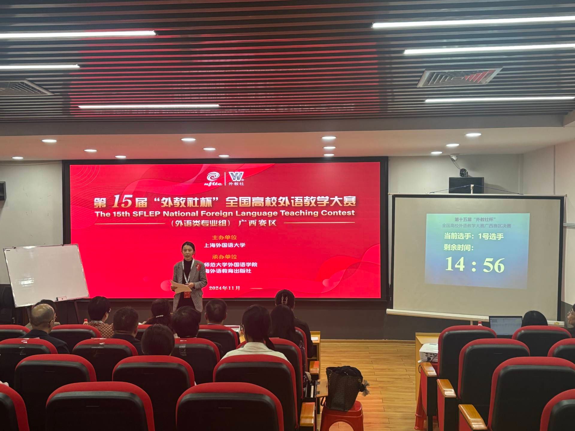 11月9日至10日,第十五届“外教社杯”全国高校外语教学大赛 (外语类专业组)广西赛区复赛和决赛在我校明秀校区举行。赛后颁奖仪式上,我校副校长龙妮娜、广西高校英语教学指导委员会主任李晓、上海外语教育出版社西南大区总经理伊静波出席并分别致辞。