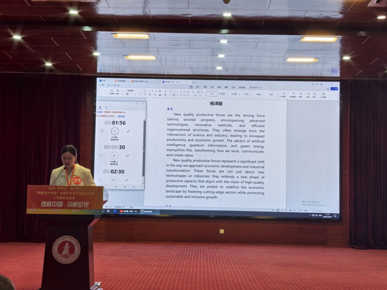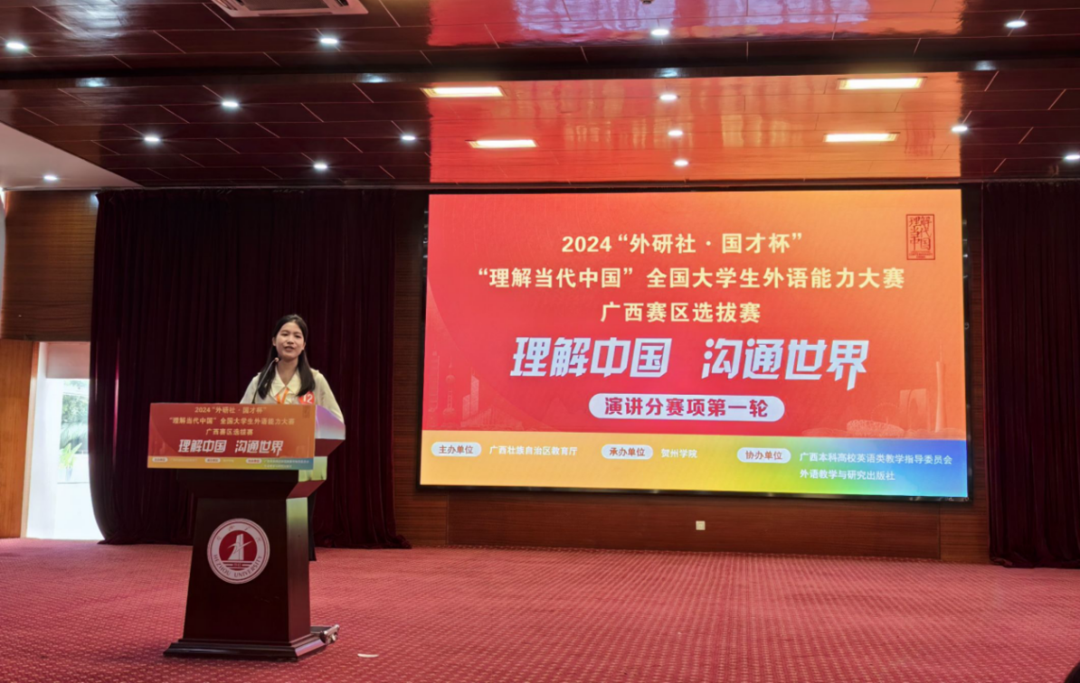 “外研社·国才杯”“理解当代中国”全国大学生外语能力大赛连续多年入选《全国普通高校大学生竞赛分析报告》竞赛目录,此次广西赛区选拔赛共有来自全区41所高校近600名学生参赛。大赛以“理解中国,沟通世界”为主题,引导大学生领会习近平新时代中国特色社会主义思想核心要义,提高用英语讲好中国故事、传播中国声音的能力,我校高度重视英语学科竞赛工作,通过组建指导教师团队,积极筹备各分项赛事等举措,加强竞赛的组织和赛前指导工作。