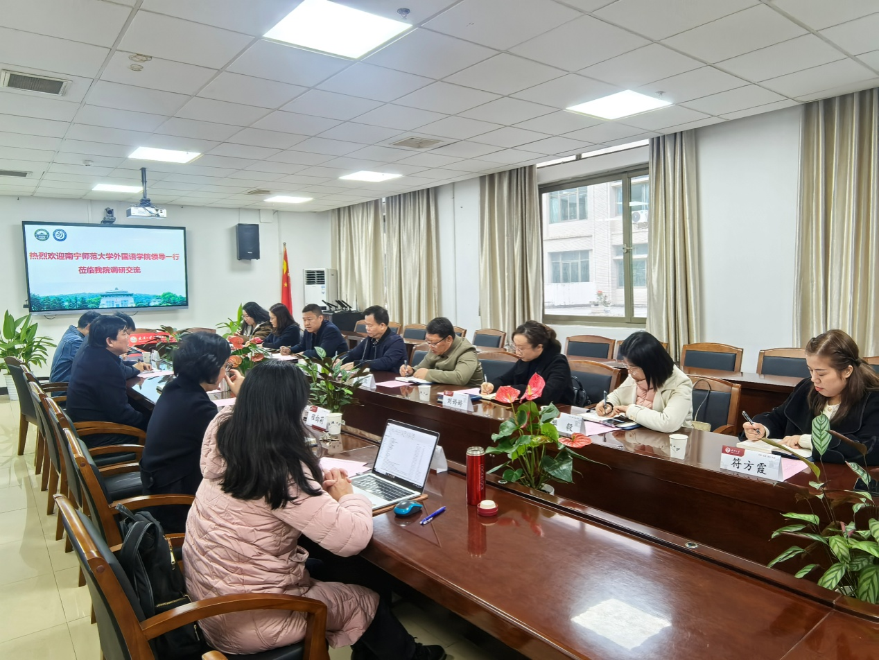 2024年11月26日下午,代表团到武汉大学外国语言文学学院调研学习,与黄宏发书记、李圣杰院长等领导和教师进行了深入的座谈交流。座谈会上,武汉大学外国语言文学学院对南宁师范大学必威西汉姆联官网代表团的到来表示热烈的欢迎。学院党委书记黄宏发介绍了学院的基本情况和办学历程。党委副书记刘涛就人才培养路径、模式及协同育人方面进行了分享。程向莉副院长从课程目标设置、教学资源库和案例库的搭建、教材的编写等方面展示了学院在课程思政建设上的具体做法和取得的成果。熊伟主任介绍了翻译学科的建设情况,包括学科的发展历程、以项目为驱动的发展模式、武汉大学口译队的辉煌成绩、校企合作实践,以及翻译技术在教学中的运用。李丹丽副主任就学院在科研和国际交流方面的进展和成效进行了分享。陈光伟院长对武汉大学外国语言文学学院的热情接待和宝贵经验的分享表示了感谢。他表示,南宁师范大学必威西汉姆联官网将认真学习和借鉴武汉大学外国语言文学学院在教育教学改革、人才培养等方面的先进经验,结合自身特色,进一步深化外语教学改革,加强国际交流与合作,培养更多符合国家战略需求的外语专业人才。