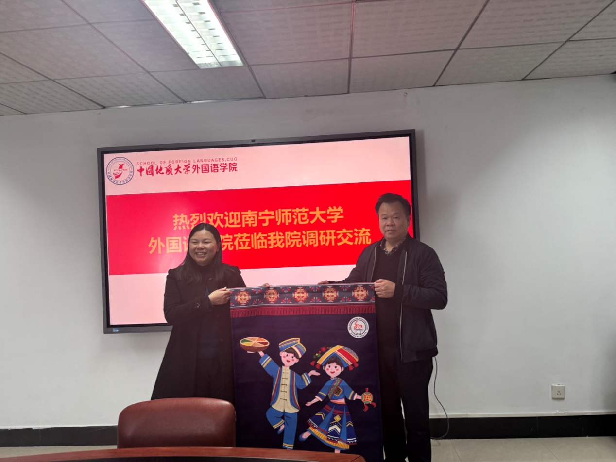 2024年11月27日上午,在中国地质大学(武汉)必威西汉姆联官网,代表团与余尚蔚副书记、杨红燕副院长等六位领导老师进行了座谈交流。杨红燕副院长介绍了学院的基本情况和科技翻译人才培养的特色工作经验,余尚蔚副书记介绍了学生管理和升学就业情况,董成见老师介绍了实验教学中心的建设工作,姚夏晶副主任介绍了实习实践基地建设和人才培养品牌建设,黎颖辅导员介绍了学生心理工作机制和成效。陈光伟院长也介绍了南师大外院的办学经验及特色,并就学生培养、就业促进、课程教改项目及活动、特色团队培育等方面与对方进行了深入交流。