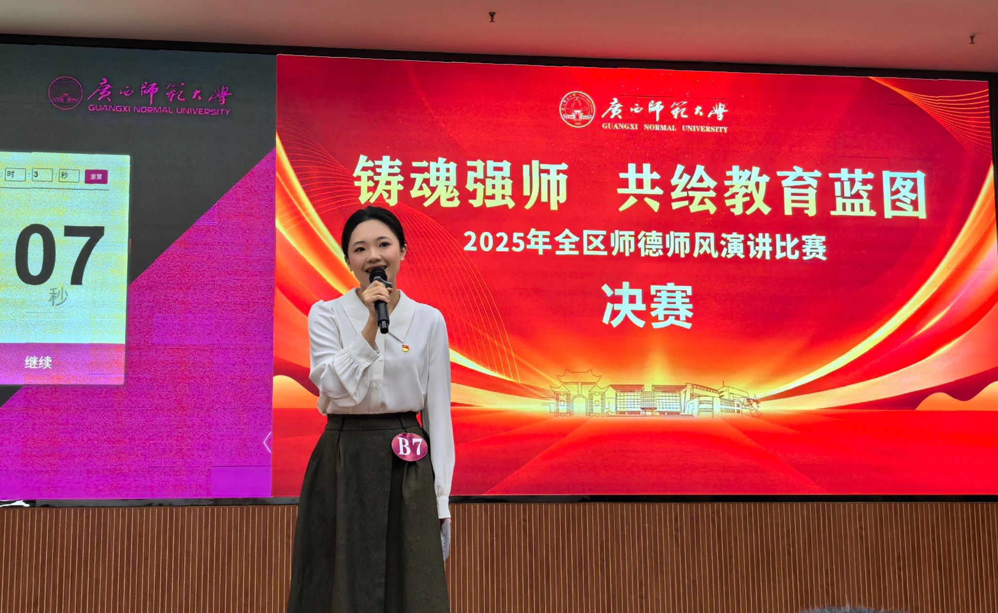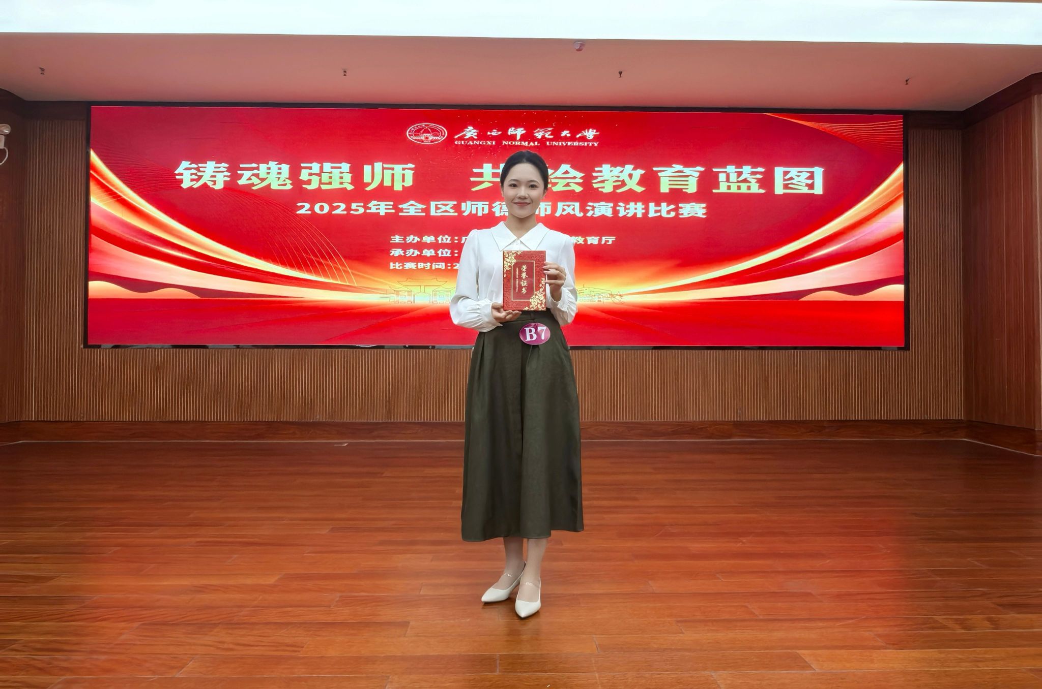 11月8日至9日,由广西壮族自治区教育厅主办的2025年全区师德师风演讲比赛在广西师范大学举行。必威西汉姆联官网2023级英语专业2班刘静怡同学荣获高校师范生组一等奖,展现了外院学子的卓越风采与扎实素养。