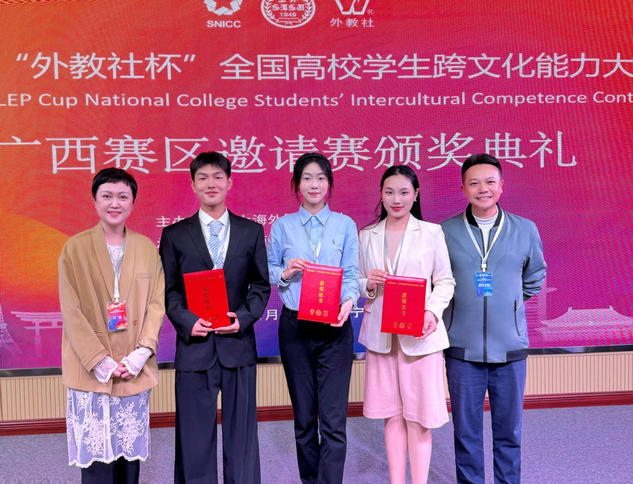 近日,第八届“外教社杯”全国高校学生跨文化能力大赛广西赛区比赛圆满落幕。我校代表队以稳定沉着的临场表现和过硬的专业能力在强手云集的赛场中脱颖而出,成功获得广西赛区总分第二名,顺利晋级全国总决赛。本次赛事由上海外国语大学主办、广西民族大学与上海外语教育出版社联合承办,是高校外语教育领域高水平赛事,入选《2023全国普通高校大学生竞赛分析报告》竞赛目录,受国家层面重点关注。