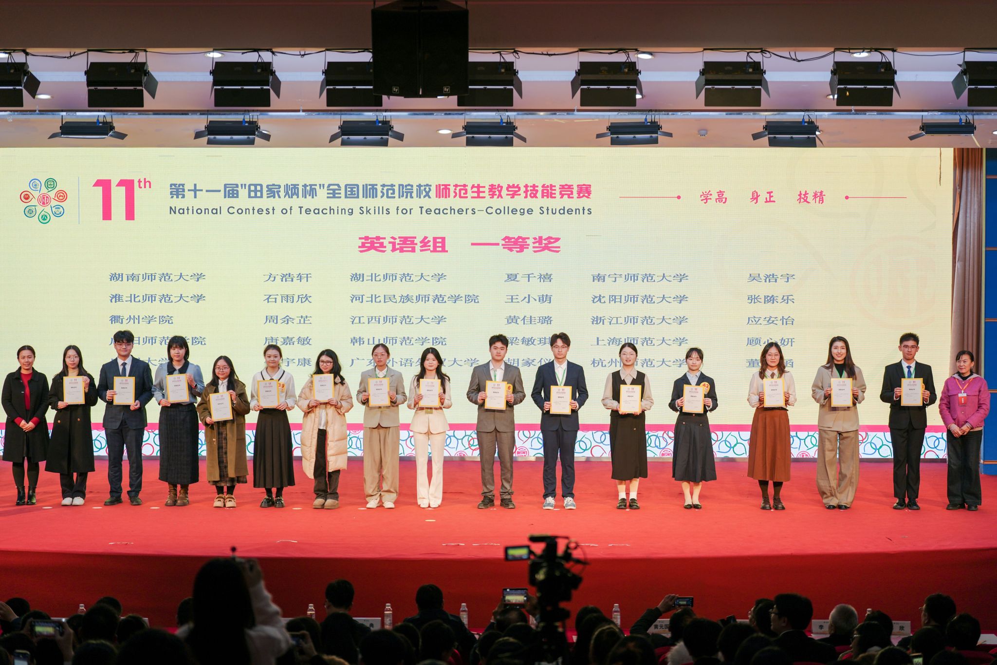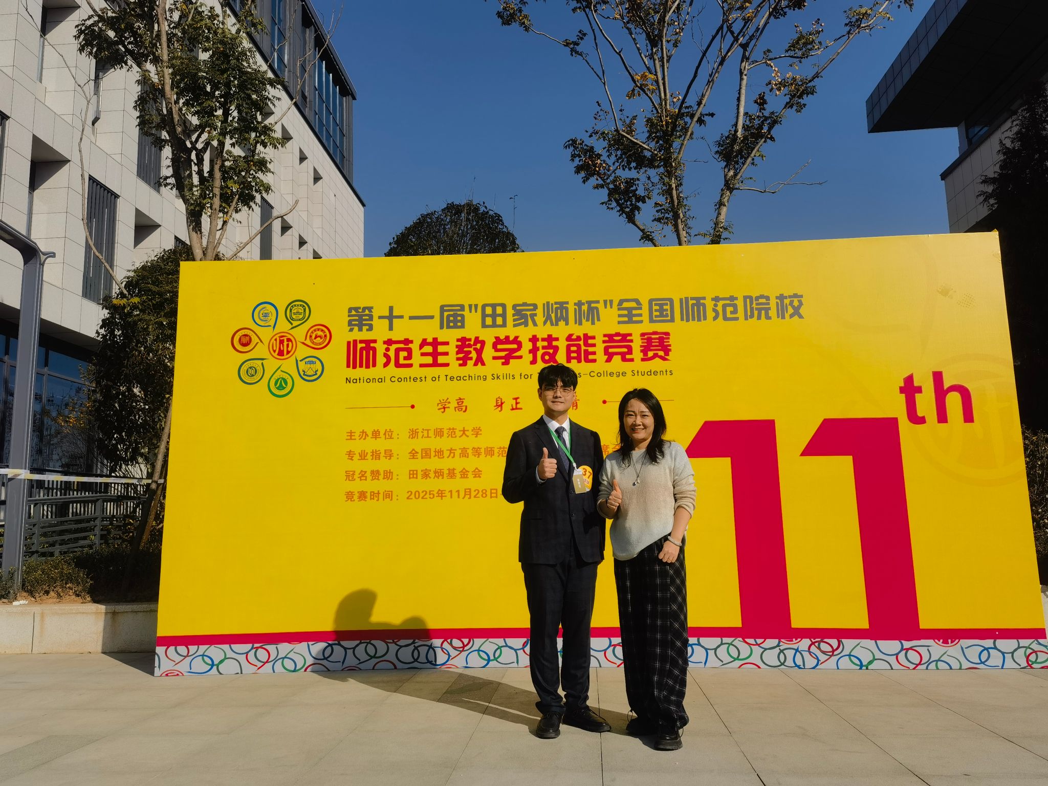 本届赛事竞争空前激烈,初赛阶段便吸引了来自全国289所师范院校的2345名选手同台竞技。经过严格筛选,仅有178所院校的564名选手获得晋级全国决赛的资格,决赛晋级率不足25%,而在强手如林的英语学科组中,仅有45名选手脱颖而出进入最终角逐。吴浩宇同学凭借其创新的教学设计、扎实的语言功底与沉稳从容的现场表现,赢得了评委的高度认可,最终站上了一等奖的领奖台。