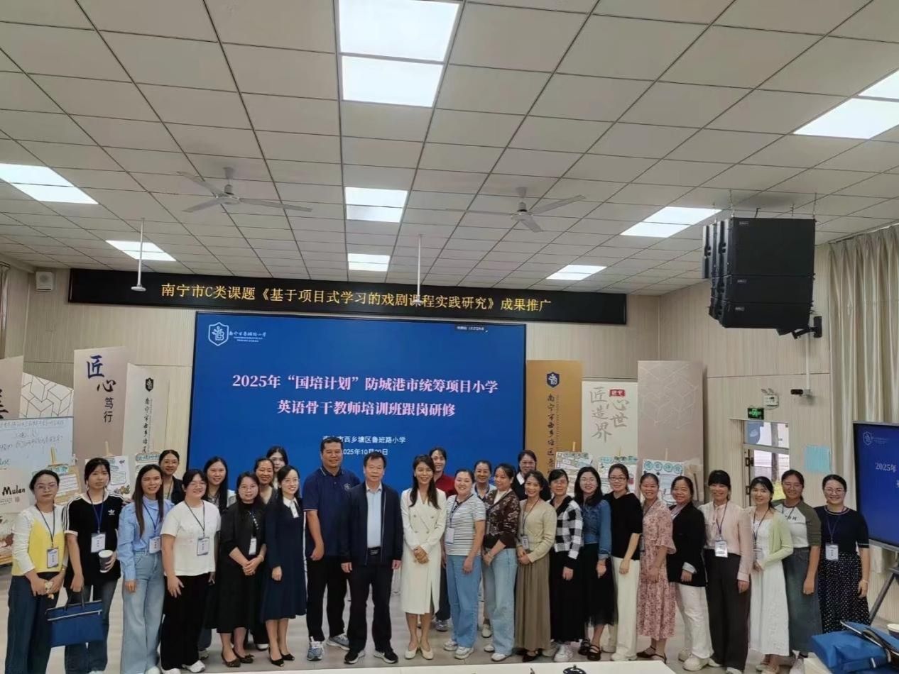 在南宁市鲁班路小学,校长吴静组织了该校主持的南宁市C类课题《基于项目式学习的戏剧课程实践研究》成果推广会,同时对接2025年“国培计划”防城港市统筹项目小学英语骨干教师培训班的岗研修工作。在活动现场,陈光伟院长结合高校外语教育前沿理念,为参训骨干教师解析了项目式学习与戏剧课程融合的教学方法,针对小学英语课堂实践难点提供了专业建议,现场教研互动氛围热烈,有效助力边境一线教师英语教学教研能力的提升。