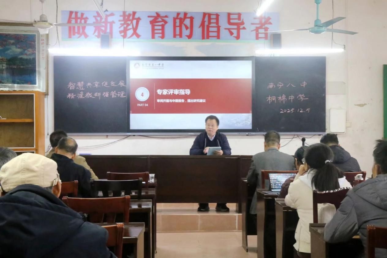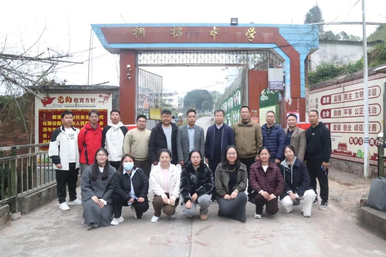 12月5日,陈光伟院长应邀到边境地区的宁明县桐棉中学参加了南宁市第八中学以“智慧共享促发展,精准教研铸同心”为主题的送教帮扶活动。在校长周荣臻的陪同下,实地了解学校外语教学现状。在桐棉中学会议室,首先召开了2025年南宁市教育科学专项课题开题论证会,围绕边境一线教师基础教育课题研究展开交流。南宁八中的七名教师先后分享了课题开题报告及区级课题中期进展情况,陈光伟教授对课题选题的精准性、城乡协作的创新模式给予肯定,同时针对性地提出聚焦核心、细化路径等优化建议。随后陈光伟院长与学校领导教师开展座谈,重点调研边境中学对外语人才的核心需求——包括适应边境教育实际、具备跨文化沟通素养的英语教师能力等。双方围绕高校外语专业人才培养方案优化、实习支教等内容深入交流,为后续校地协同培育基层外语教育人才明确了方向。