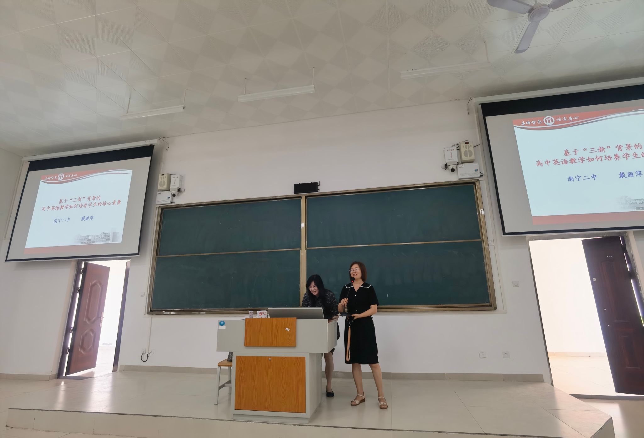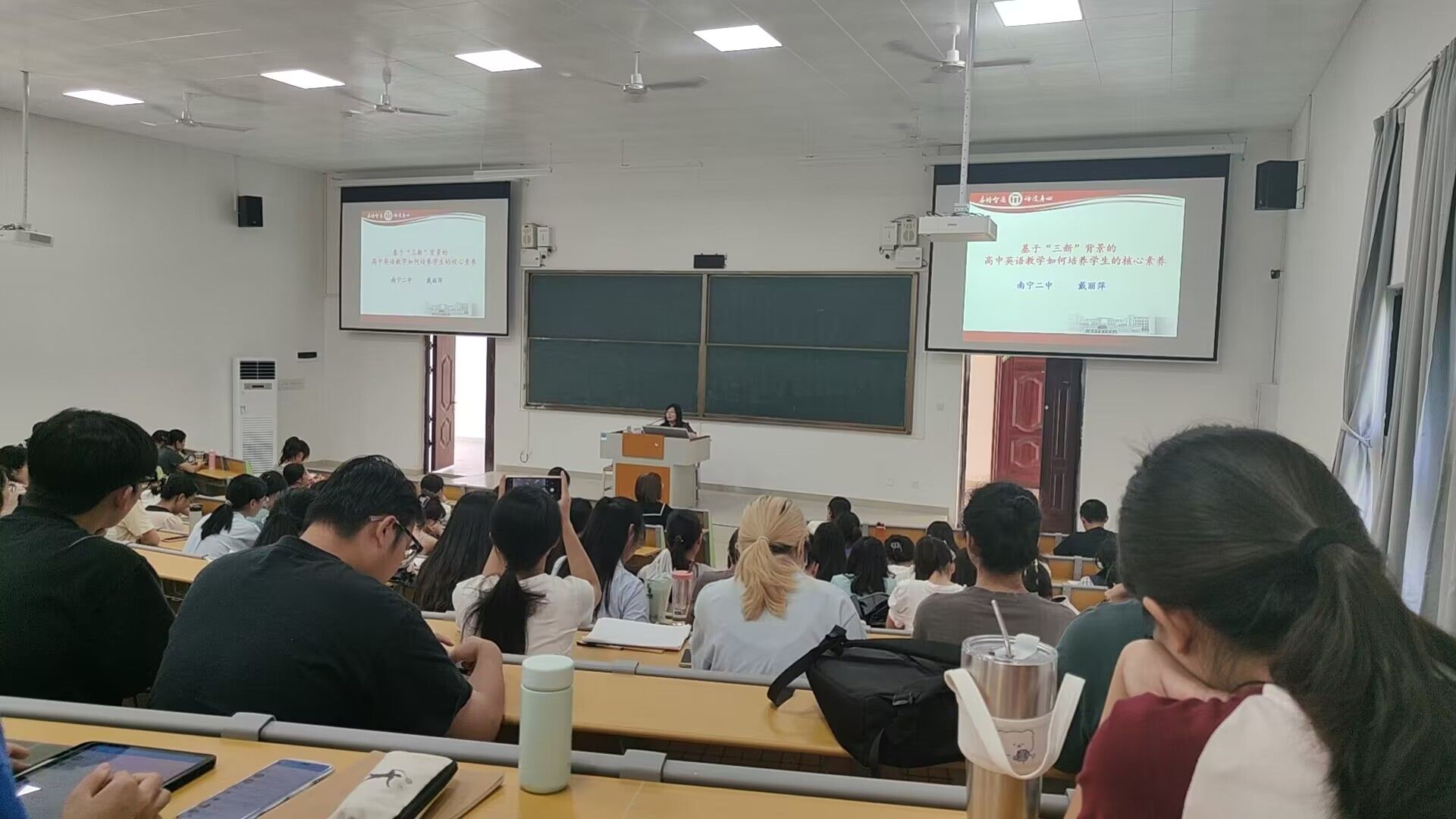 为促进英语专业师范生核心素养的养成,2023年9月21日下午,南宁市第二中学英语特级教师戴丽萍老师为英语专业师范生做“基于‘三新’背景的高中英语教学如何培养学生的核心素养”的专题讲座。本次讲座是英语专业《基础教育英语课程改革》系列专题之一,讲座由邓芳娇老师主持,必威西汉姆联官网蒙岚副院长、林绍丽老师以及2022级学科教学(英语)专业、2020级英语专业1-5班和陶行知实验班全体学生参加了此次讲座。