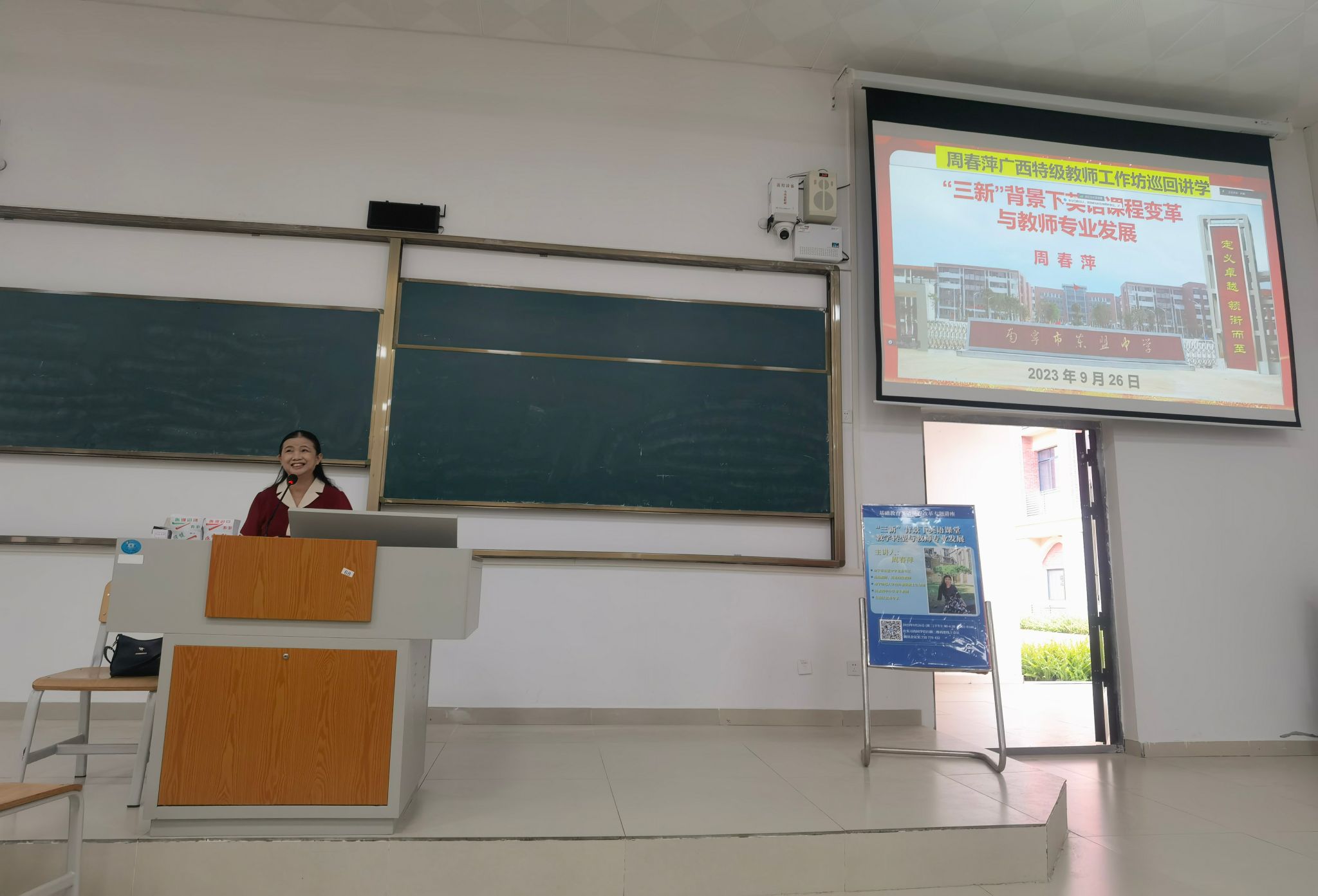 为促进英语专业师范生核心素养的养成,2023年9月26日下午,南宁市东盟中学党委书记、英语特级教师周春萍老师为英语专业师范生做题为《 “三新”背景下英语课程变革与教师专业发展》的专题讲座。本次讲座是英语专业《基础教育英语课程改革》系列专题之一,讲座由蒙岚副院长主持,邓芳娇老师、林绍丽老师以及2022级学科教学(英语)专业、2020级英语专业1-5班和陶行知实验班全体学生参加了此次讲座。