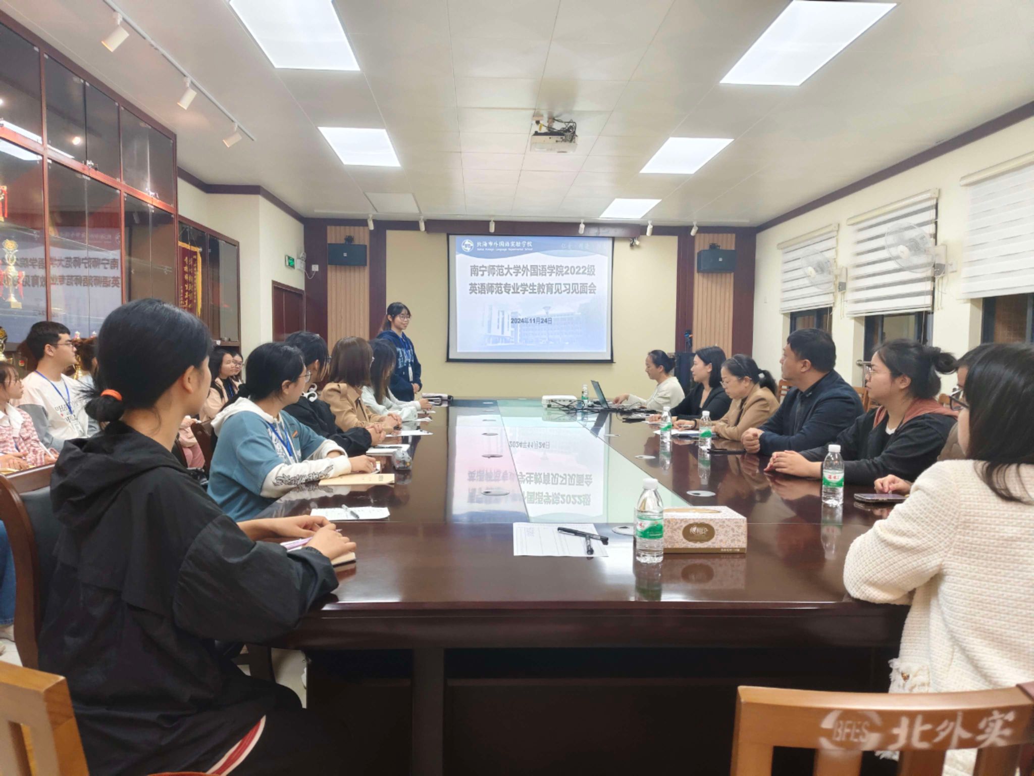 2024年11月24日,为表达欢迎并帮助见习生尽快熟悉和适应学校情况,北海外国语实验学校的领导和指导老师们与我院见习生一起召开了见面会。北海外国语实验学校李艳玲副校长、周光辉副校长,见习年级的年级长和全体见习指导老师及南宁师范大学必威西汉姆联官网的带队老师邓芳娇携2022级英语师范专业行知班的20名见习生一起出席了会议。