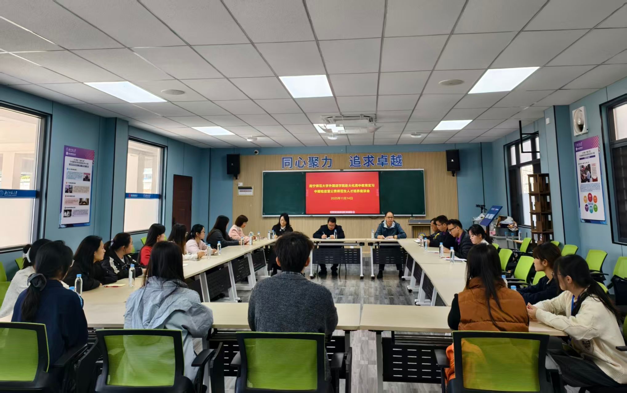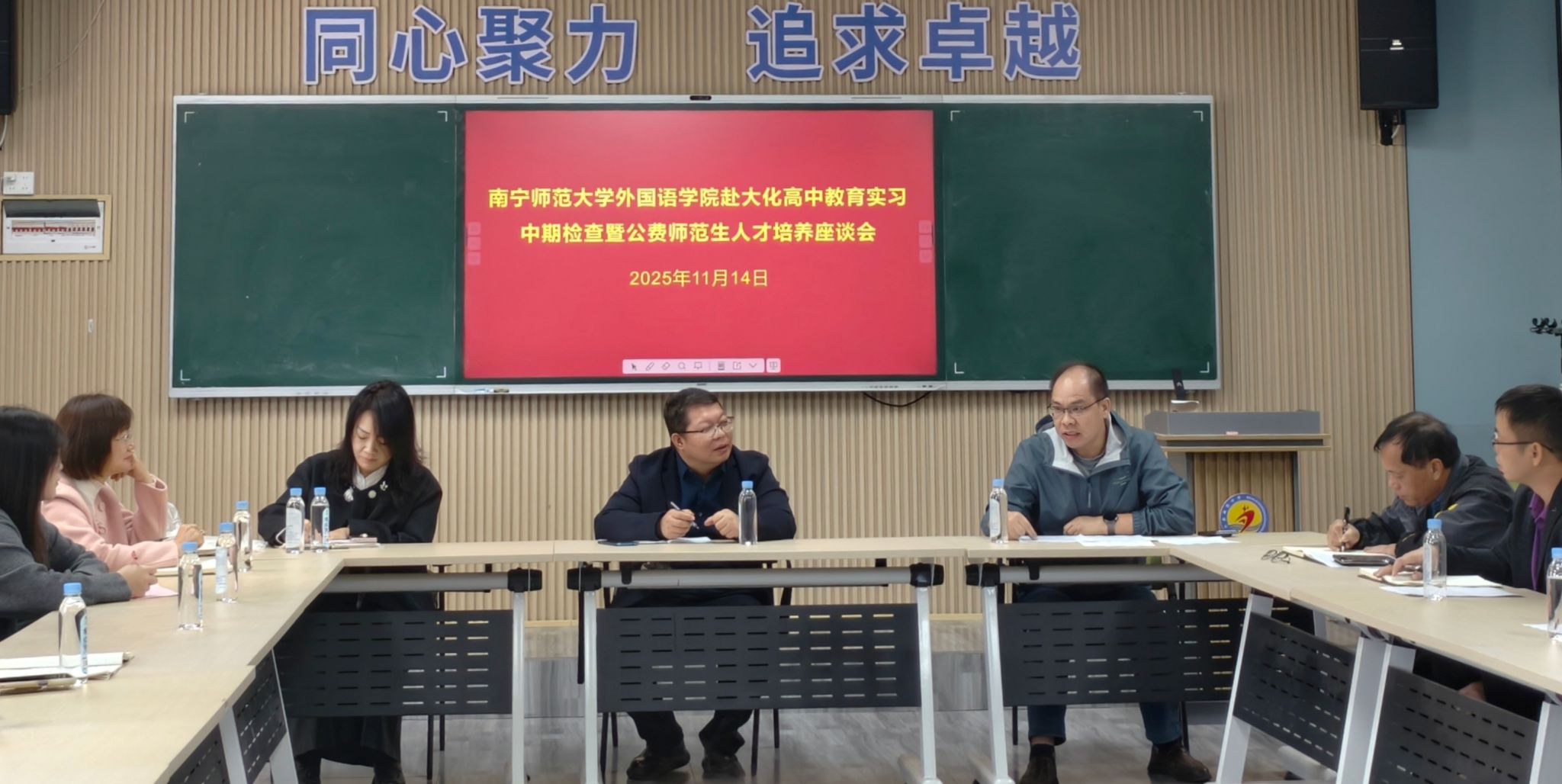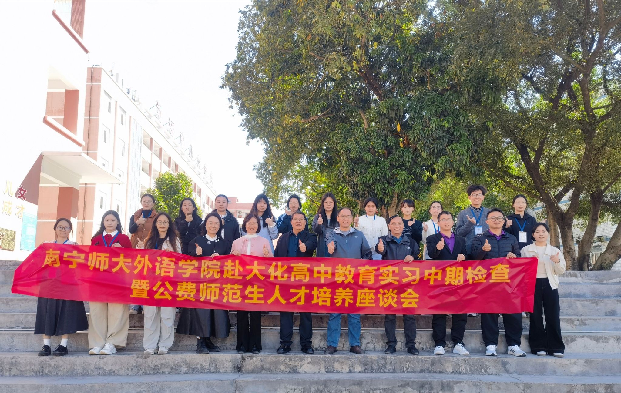 11月14日上午,南宁师范大学必威西汉姆联官网赴大化高中教育实习中期检查暨公费师范生人才培养座谈会在大化瑶族自治县高级中学3号教学楼强师工作室圆满召开。南宁师范大学必威西汉姆联官网张晓鹏副院长,教师教育教研室主任林绍丽老师,区级教师教育类课程教学团队负责人邓芳娇老师,大化瑶族自治县高级中学主管教学的黄克勋副校长,教务处韦金宏主任及实习生指导教师代表,以及全体南宁师范大学必威西汉姆联官网2022级英语专业公费师范实习生共同参会,会议由大化高中韦标东老师主持。