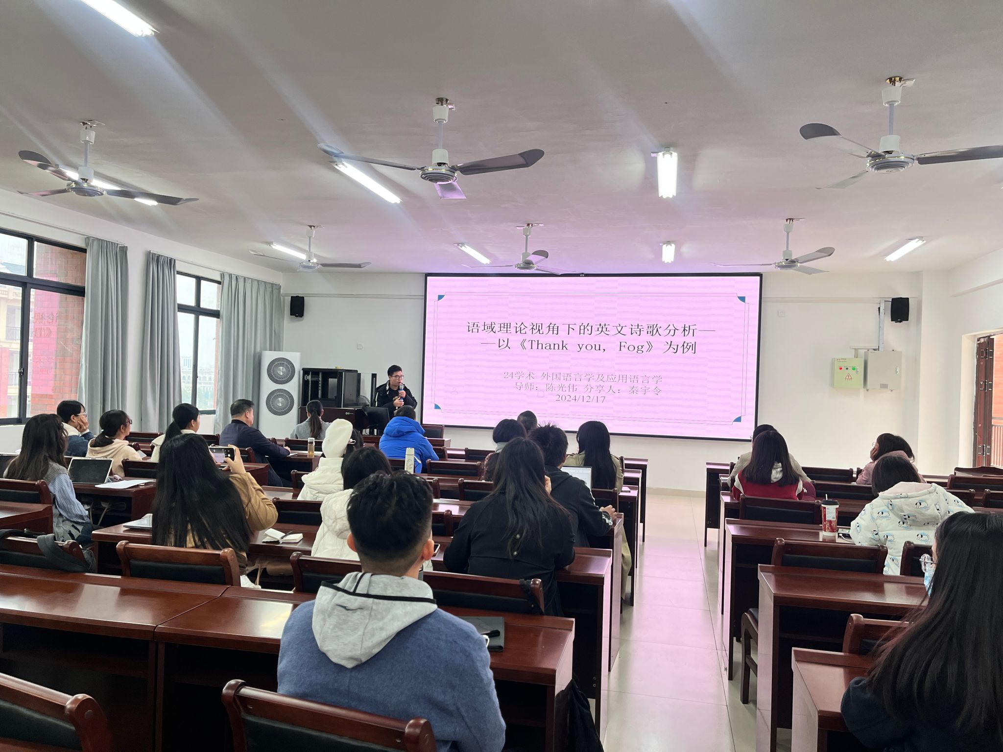 首先,由秦宇令同学介绍其论文:语域理论视角下的英文诗歌分析—以《Thank you, Fog》为例。他分享了以语言学理论分析诗歌的这种跨学科融合的新视角。蒙岚教授高度赞扬秦同学虽为研一新生,但其敢于探索的精神值得赞扬。紧接着,余洁同学分享了Python驱动的批评话语分析:越南主流媒介中的中国高等教育形象。陈光伟教授赞扬余同学善于运用新颖科研工具,鼓励与会同学向其学习。李惟暘同学以《数字化教育背景下批判性思维在高中英语教学中的作用与挑战》为题,指出数字化教育对高中生英语批判性思维方面所施加的积极影响,但同时也对未来教学产生的挑战。赵凤玉教授对此提出相应建议,并对其运用数字化手段进行研究表达肯定。接下来分享的是李婷同学,她以《少数民族地区语言景观研究—基于Citespace的数据分析图谱》为题,阐述了自己在研究中的研究方法和研究困难,老师们对此提出了改进方向,并对其研究给予赞扬。第五位同学是严景坤,他基于语料库的高中英语阅读教学模式构建研究,分享了以BNC(British National Corpus)为主的语料库用法,并将其融合到高中英语阅读教学之中。黄信教授肯定严同学的思路,但还提醒其要注意实际应用的困境。接下来,杨明凤同学从空间视域对《美国牧歌》中梅丽的身份建构进行了研究。她基于佐伦的空间视域理论,从地志空间、时空体空间和文本空间三个方面分析了梅丽的身份建构过程,揭示出少数族裔移民建构自我身份的不易以及空间对于个体身份建构的重要性。江玉娥教授肯定了杨同学的研究方向,同时指出论文存在三个纬度之间层次不够明显的问题,认为理论与文本分析还需要进一步结合起来。补云桐同学则对菲利普·罗斯《凡人》的疾病书写进行了独到的分析,探析了主人公分别于生理和心理层面上的疾病症候,并通过疾病反思现实境况。黄霞同学从凝视理论出发,研究了《所罗门之歌》中非裔美国女性的生存困境。她基于穆尔维的男性凝视理论,结合福柯和拉康有关凝视和女性主义的观点,解读非裔美国女性在父权社会下的生存困境,姚本标教授对于其精彩解读给予深度肯定。