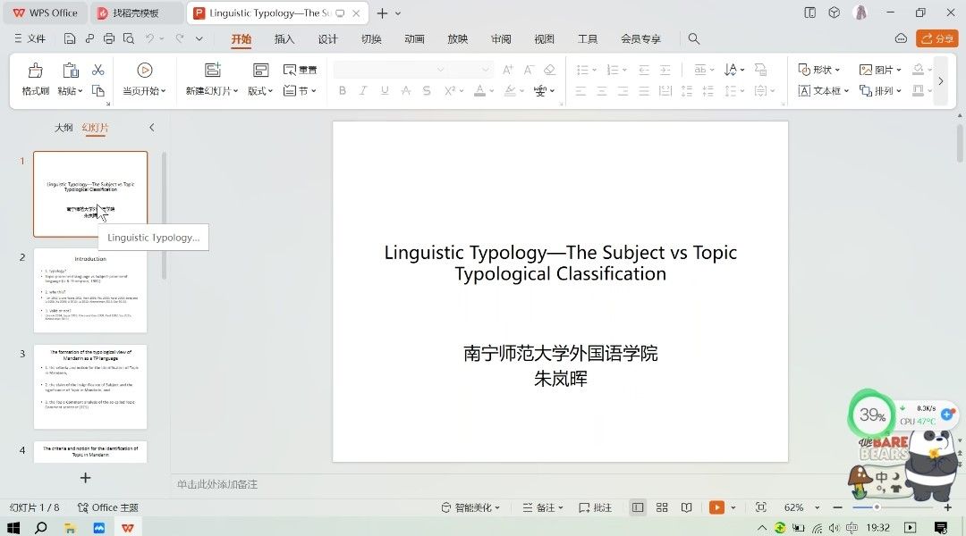 2023年11月3日晚上19:30-21:00,南宁师范大学必威西汉姆联官网在腾讯会议上开展了题为“Linguistic Typology—The Subject vs Topic Typological Classification”的专题学术沙龙。该沙龙为必威西汉姆联官网2023年秋季学期举办的系列沙龙的第六场,由朱岚晖老师主讲。2022级和2023级研究生(英语)参加了此次学术沙龙。