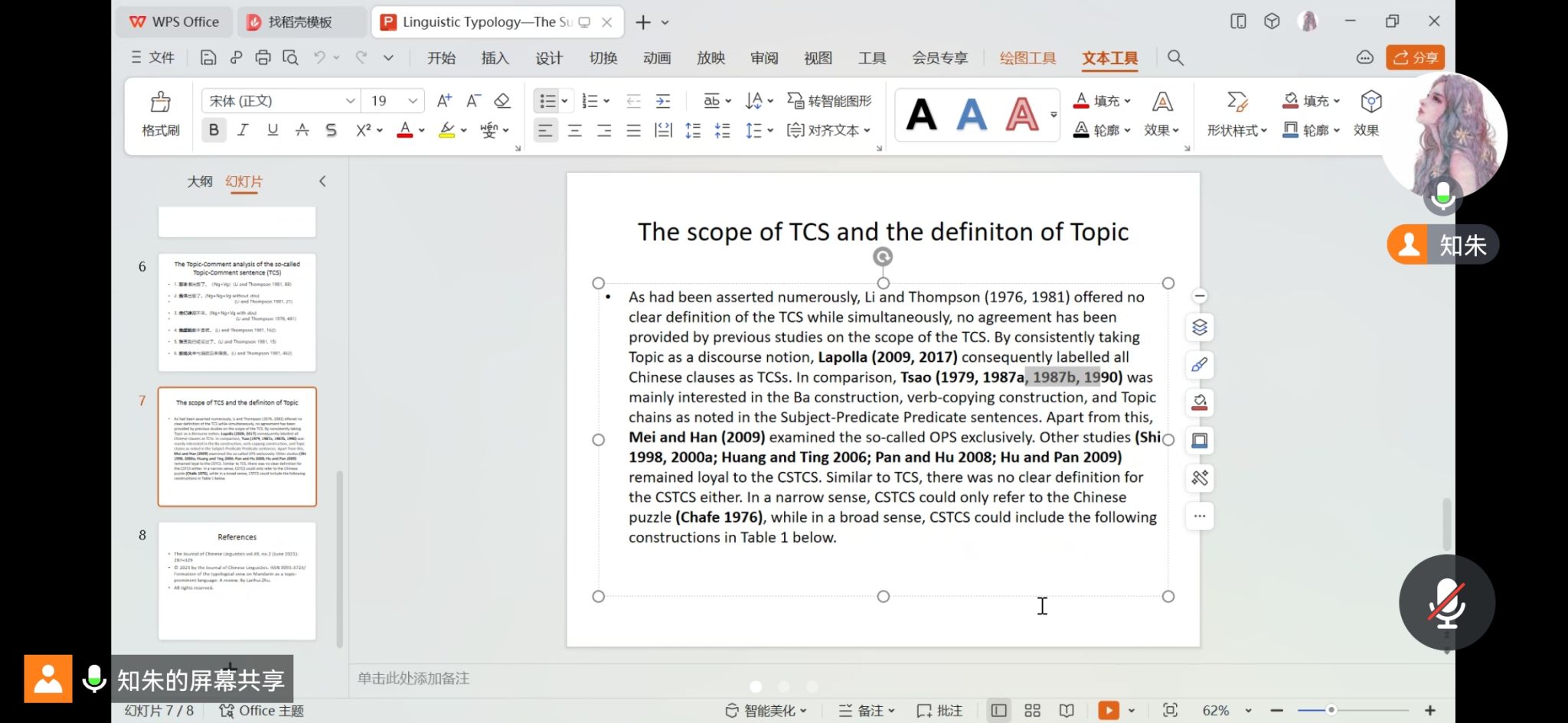 自上世纪八十年代起,汉语被普遍认为是一种“主题突出的语言”并经常被引用到汉语的相关研究中。虽然这一类型学观点的可信度早已受到质疑但相关研究的进展比较缓慢。为帮助英语专业研究生厘清此类型学观点的有效性,亦为后续研究可以更好地审视这一类型学观点的可信度,朱岚晖老师重新回顾了Li和Thompson提出的类型学观点的形成和一些相关研究,介绍了什么是类型学,罗列了前人研究类型学观点的情况,并分析了类型学观点是否有可信度。类型学强调汉语是主题突出的语言,英语是主语突出的语言,进而得出世界上的语言可以通过主题和主语的重要性来划分为主题突出、主语突出、两者都不突出和都突出的语言。前有学者指出:一个句子中的主题是指这句话是关于什么的,主题位于句首,主题代表旧信息,主题必须是确定的,主题后面要跟语气停顿助词。对于以上情况,该讲座从汉语是主题突出的语言的学术观点出发,考察了该观点的可信度,提出了前人没有也无法对主题给出一个明确的定义,对其范围也没有达成一致。以“我喜欢吃苹果”等一些生活中常见的句子为例,分析了将主题当成句法概念和不当成句法概念都将出现矛盾和道理不通的情况。同时通过统计数据来佐证前人研究所采用的汉语例句只占语料库极少的百分比来表示形成该观点的研究的不足。