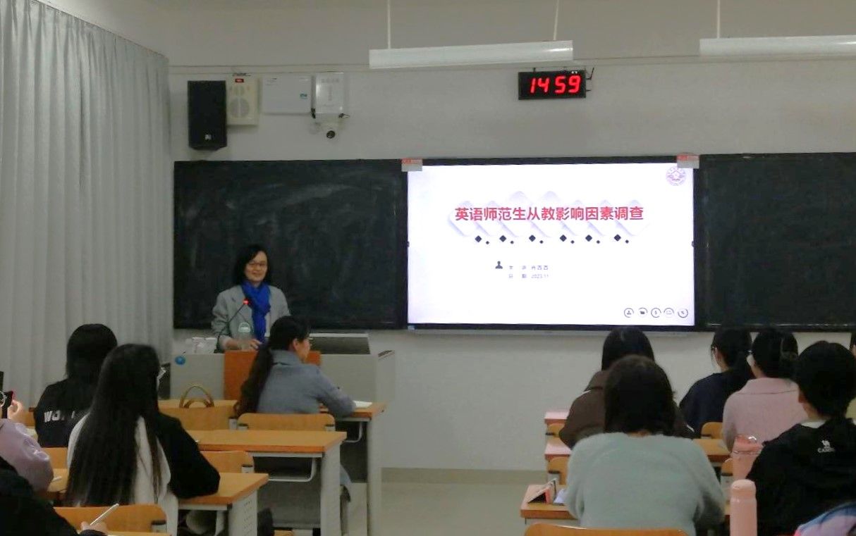 为了进一步提升英语专业研究生论文撰写的规范性和科研能力,2023年11月14日下午14:30-16:30,南宁师范大学必威西汉姆联官网肖西西副教授在实验楼B座2栋203教室开展了题为“英语师范生从教影响因素调查”的专题学术沙龙。该学术沙龙为必威西汉姆联官网2023年秋季学期举办的系列沙龙中的第七场。蒙岚教授主持了本次学术沙龙活动,必威西汉姆联官网2023级学科教学(英语)和学术型硕士研究生参加了此次沙龙活动。