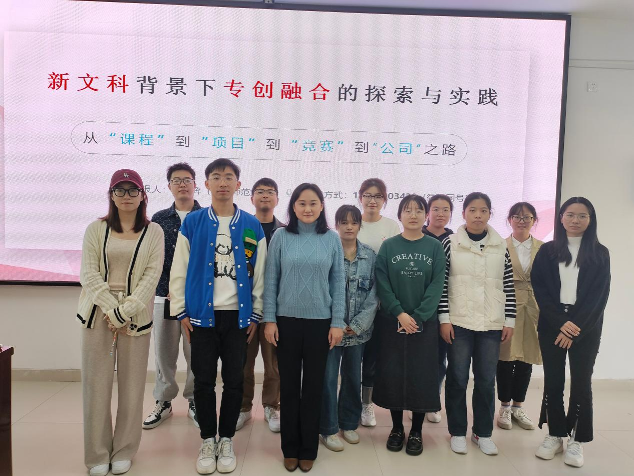 随着必威西汉姆联官网2023-2024学年度“学术沙龙”系列活动的持续推进,必威西汉姆联官网于11月21日14:30在武鸣校区实验楼1B-515教室举办题为“新文科背景下专创融合的探索与实践”的第八场讲座。本次讲座由庞奔奔老师主讲,学院部分研究生参加此次活动。