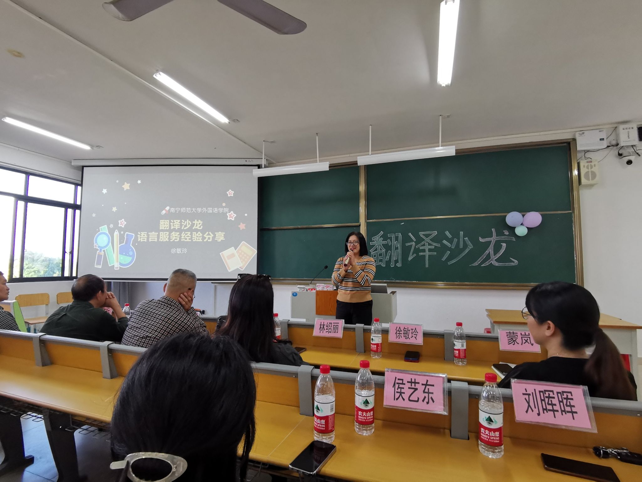 沙龙活动第一环节是语言服务经验分享,特别邀请到校企合作单位南宁博莱威翻译咨询有限公司董事长徐敏玲为同学们做外事接待服务工作指导。徐敏玲董事长语重心长地与同学们交流,将自己参与翻译服务工作的经验和注意事项倾囊相授,勉励同学们不仅仅要学好翻译技能,还要提高服务能力。