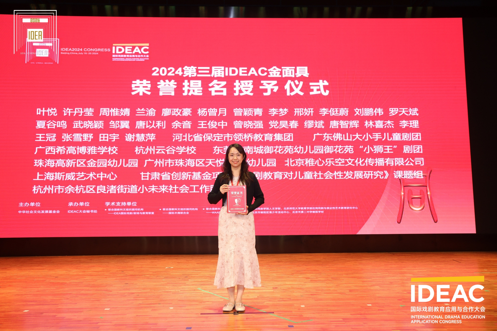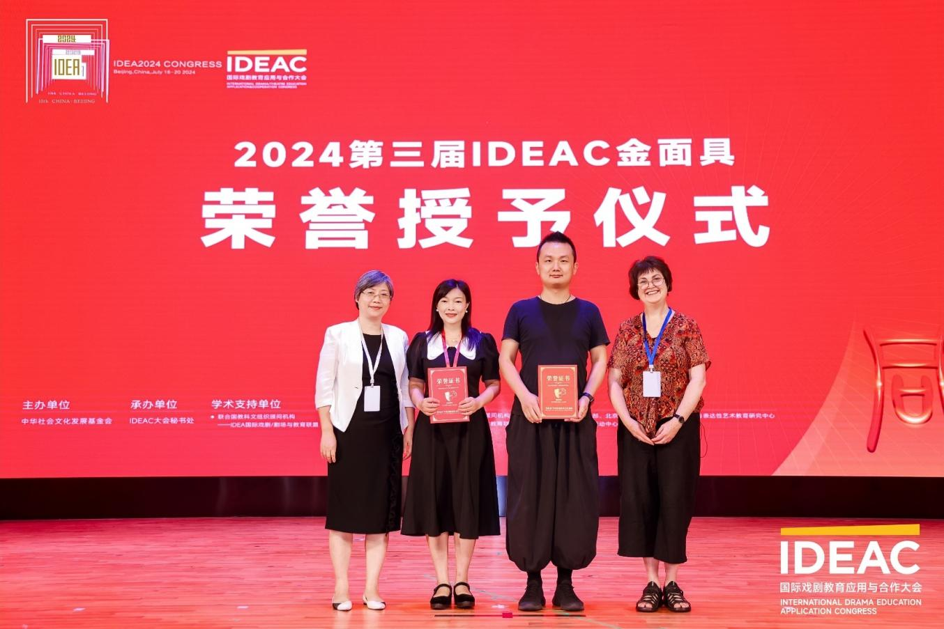 南宁师范大学必威西汉姆联官网教育戏剧团队多年来在高飞雁副院长的带领下立足于广西民族地区基础教育实际,以铸牢中华民族共同体意识为主线,开发系列英语教育戏剧融合课程,通过专业选修课、校级公选课、专业课教学融合、国培、区培项目、城区教研活动、中小学校本教研活动等方式实践推广,在服务教育教学的同时不断讲好民族团结故事,传播优秀传统文化,团队获得2024IDEAC“金面具”戏剧教育成果双年展“金面具杰出戏剧教育管理者”荣誉,叶悦老师获“戏剧教育综合应用与实践金面具杰出教师”提名荣誉提名。在大会上,澳大利亚戏剧协会主席、澳大利亚墨尔本迪肯大学教育学院艺术教育(戏剧)教授乔·拉斐尔和IDEAC国际戏剧教育应用与合作大会副秘书长、中华社会文化发展基金会“美育与未来素养”公益基金副主任王丽英,共同为获得该奖项的南宁师范大学必威西汉姆联官网和四川成都天府第七中学两位代表颁发荣誉证书。