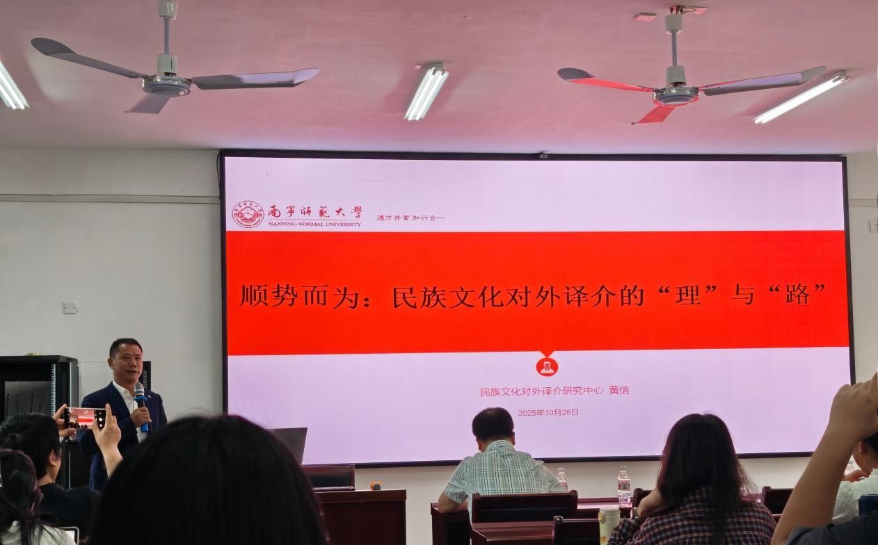 黄信教授以《顺势而为:民族文化对外译介的“理”与“路”》为题,从国家战略、民族团结、学术研究与实践应用四个层面阐述了民族文化对外译介的重要意义,系统梳理了民族文化的基本概念、结构与特性,并从传播学、民族学、翻译学、人工智能以及教育学等多个视角,探讨了对外译介的理论路径与实践方法,强调“译”与“介”并重,推动中国文化“走出去”。