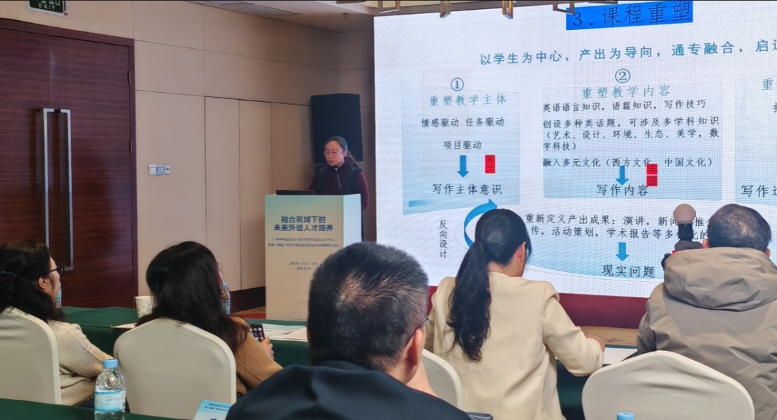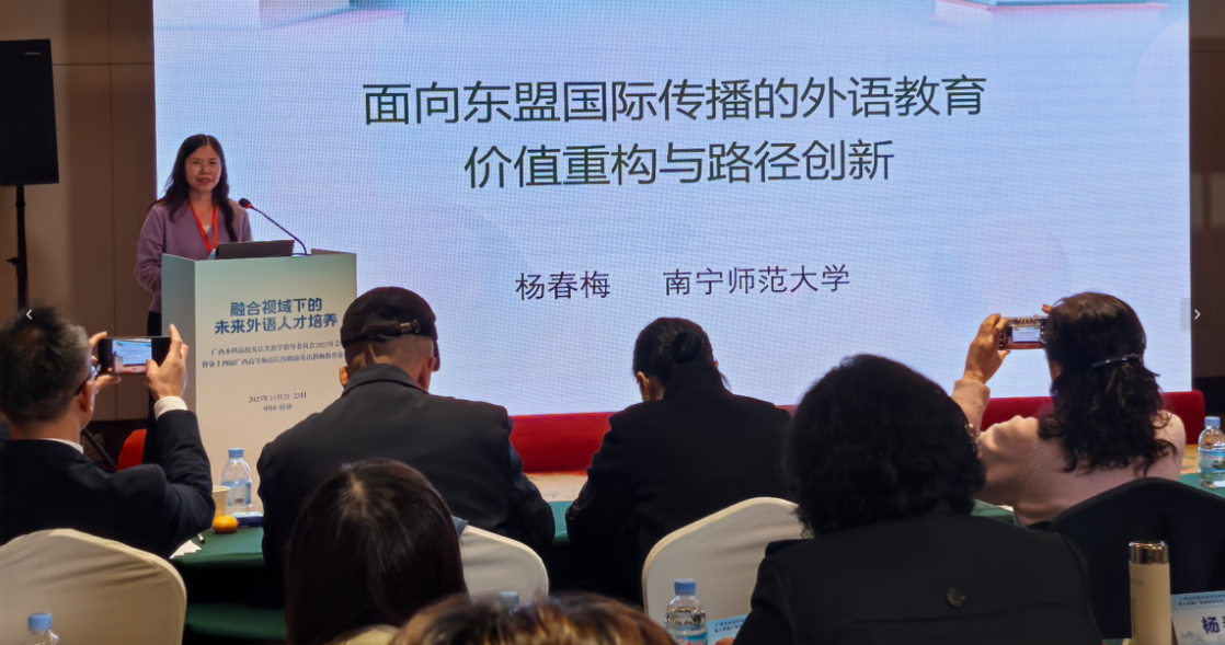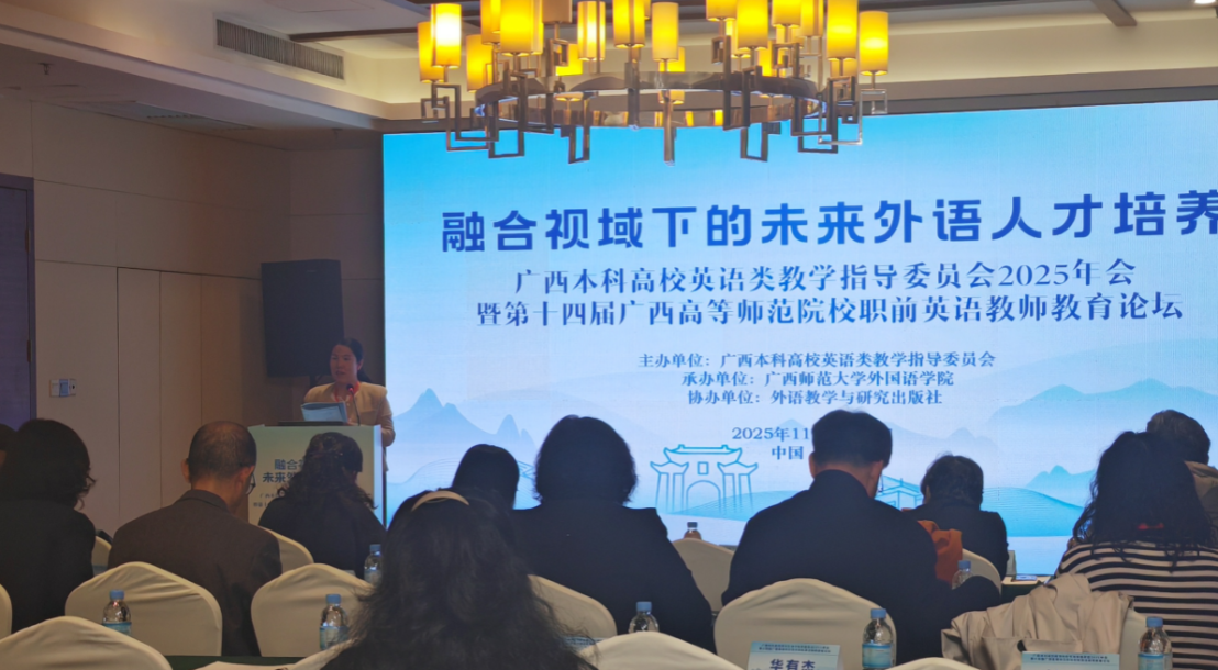 大会涵盖AI在英语教学中的应用、师范类复合型教师培养、国际传播外语教育、学术英语课程建设、AI时代外语人才培养、区域国别学建设等方面内容。其中我院教师杨春梅作为广西本科高校英语类教指委秘书长做了“面向东盟国际传播的外语教育价值重构与路径创新”的报告,为外语专业内涵重塑提供了框架和路径,特邀嘉宾蒙岚副院长进行了会议主持和点评,英语系主任刘婷婷以“超越‘纯语言’:通专融合理念驱动下的英语写作课程重塑”为题,在大会上分享南师大经验:基于英语写作课的教学目标和困境,提出了以学生为中心、产出为导向,通过重塑教学主体、教学内容、教学场景,建立多元化评价机制,实现通专融合,启迪创新。