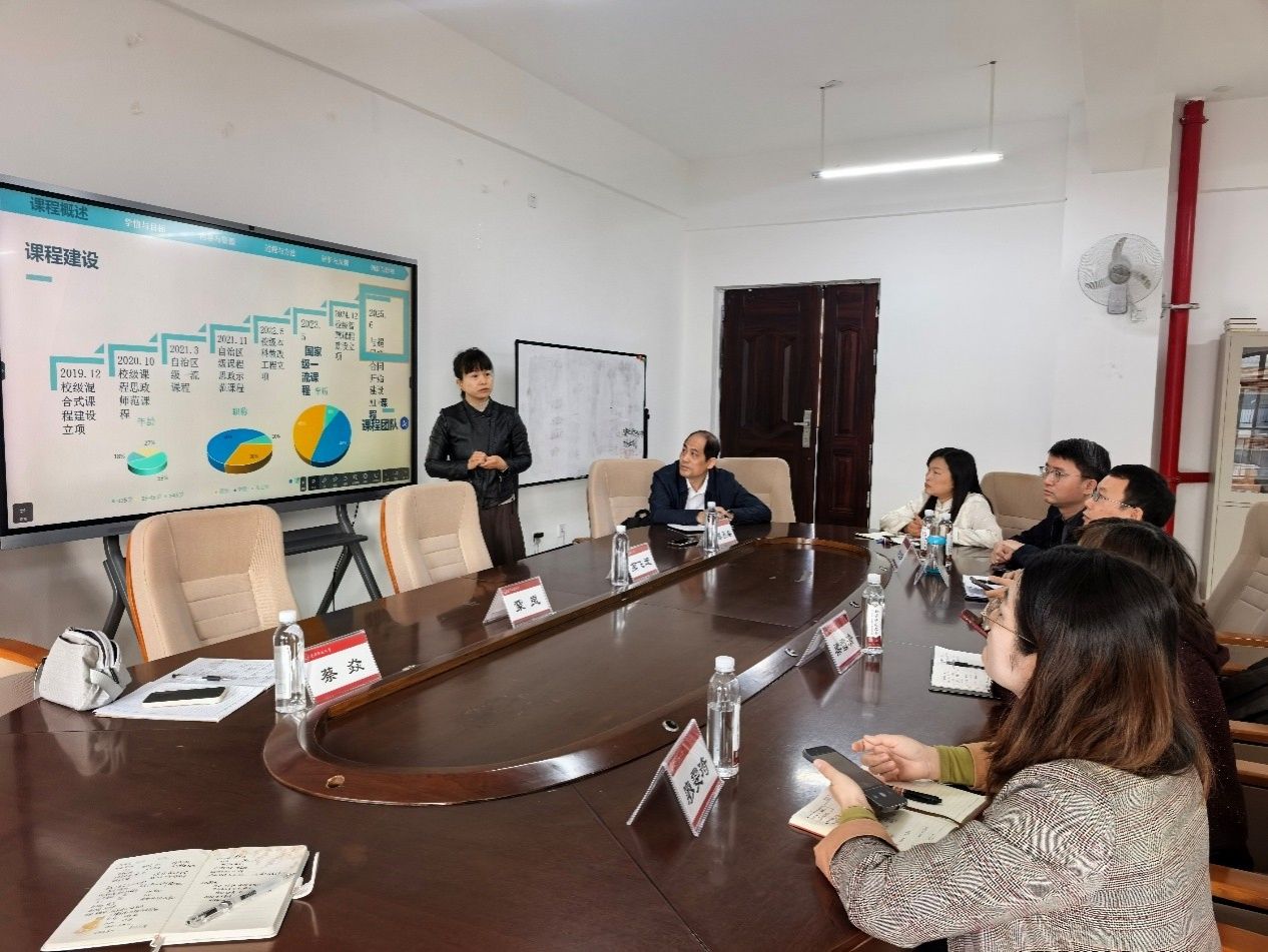 随后,双方围绕一流课程建设进一步聚焦如何应对当前大学英语教学所面临的挑战。必威西汉姆联官网国家级一流本科课程《大学英语A1》负责人蔡焱老师从课程发展历程、教学改革创新与团队建设,到后续“人工智能+课程”建设等方面,作了详细阐述与分享。来访团队对课程建设的创新成果及其显著的示范引领作用,给予了高度评价。
