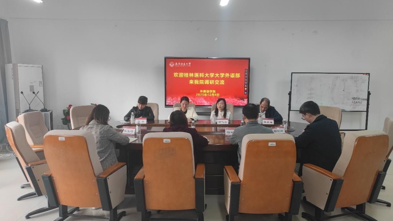 蒙岚副院长首先对来访团队致以热烈欢迎,高飞雁副院长和梁雪清主任分别介绍了各自学校的大学英语教学概况。会上,我院大外第一教研室负责人陈晨春老师从我校大学英语历年教学改革发展举措提出了现实思考,桂林医科大学的陆耀雁、廖雯琦、胡剑锋三位教研室负责人纷纷就大学英语课程设置、教学改革前景等方面与我院老师进行深入探讨。