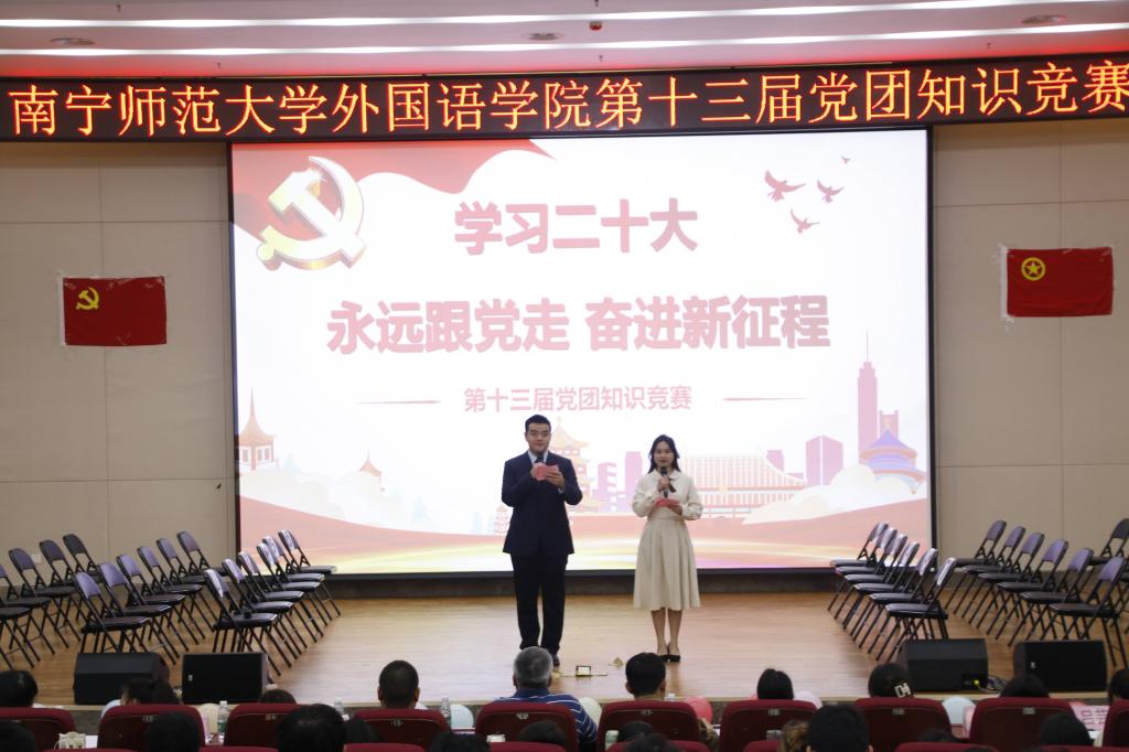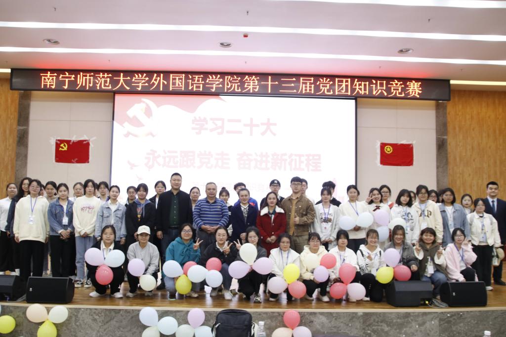 为进一步学习宣传贯彻党的二十大精神,让学生对党团知识了解更加充分,激励党员团员弘扬爱国主义精神,树立崇高的共产主义理想信念,必威西汉姆联官网于3月28日下午在武鸣校区图书馆报告厅举行党团知识竞赛。必威西汉姆联官网党委书记周国强、副书记刘晖晖和学工办蔡梓晴、古东燕、郑经华三位老师出席活动,研、本学生党支部的马辛宇、梁洁雯、黄欣楠和彭靖雯四位党员学生干部担任比赛的评委。