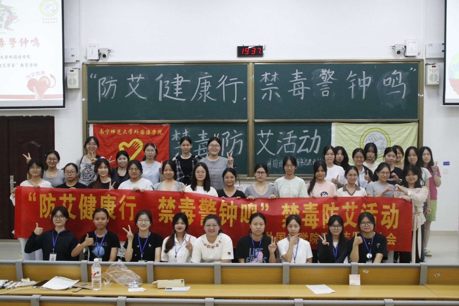 第二板块主题为“禁毒防艾小判官”是非闯关赛。9月17日晚,在实验楼1-B113教室开展。各小组4名成员协同作战,在主持人宣读题目后,举牌争夺答题权,5秒内快速判断对错。50道判断题覆盖核心知识点,答错后其他小组的补答环节更让知识在比拼中深化。最终积分前三的小组斩获奖品,所有参与者写下的认识与寄语也成为活动中最动人的宣言。