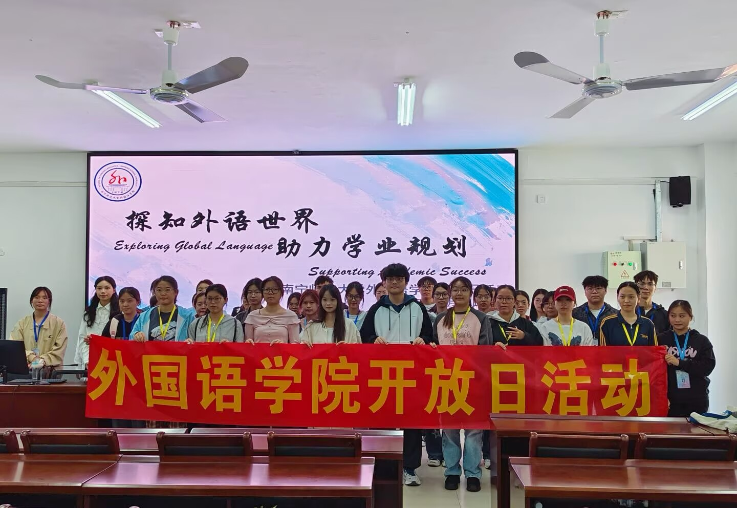 11月15日上午,南宁师范大学必威西汉姆联官网在武鸣校区1号实验楼B座顺利举办了以“探知外语世界,助力学生规划”为主题的校园开放日活动。本次活动面向全校学生,旨在展示学院学科特色与优质教学资源,为学生搭建深入了解外语学习与未来发展的平台。