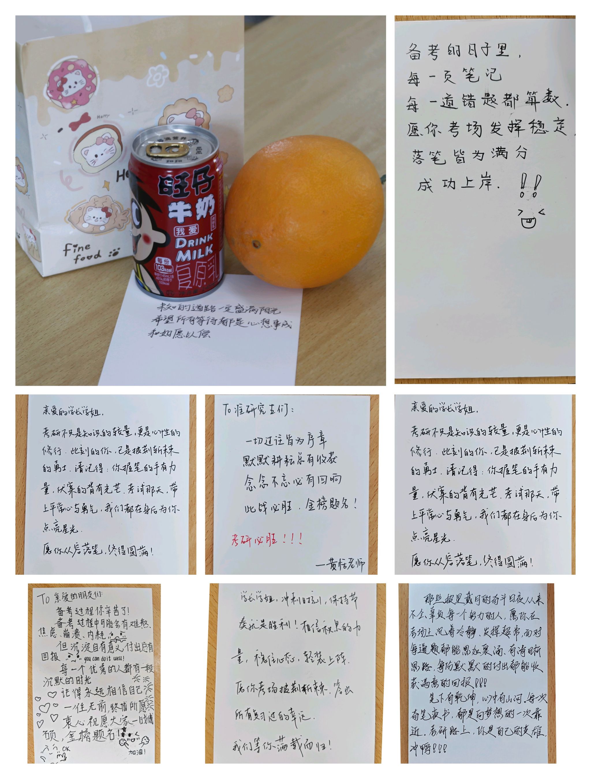 此外,学院还组织外院学子为考研学长学姐手写鼓励卡片,并送上寓意“心想事成”的橙子与“好运旺旺”的旺仔牛奶,传递深切关怀与美好祝愿。