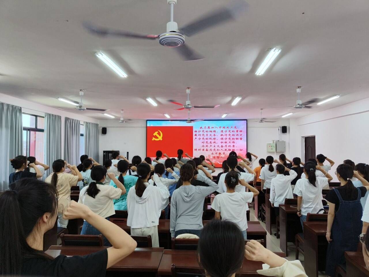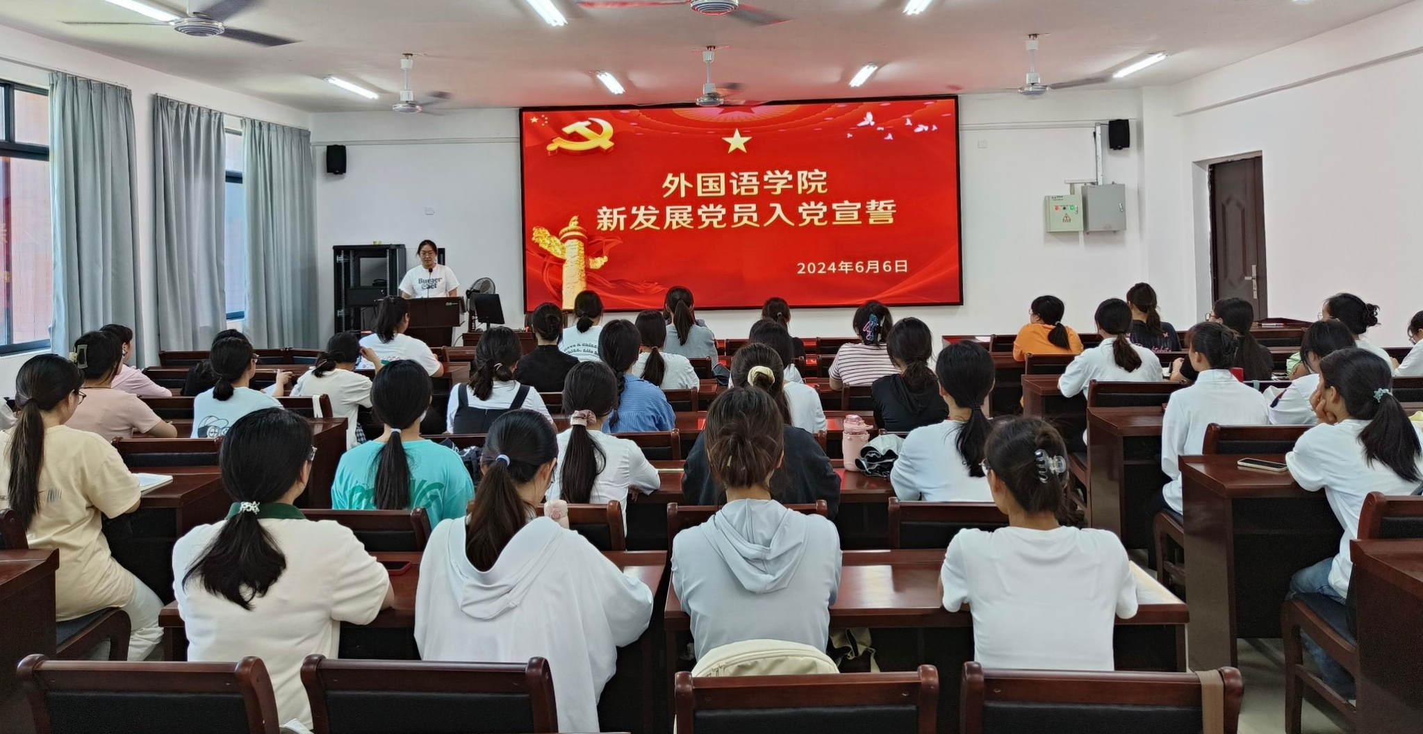 仪式在奏唱《国际歌》中开始,现场为每一名新发展的党员颁发了党员徽章。新发展的党员佩戴党员徽章,举起右拳,面向党旗庄严宣誓。
