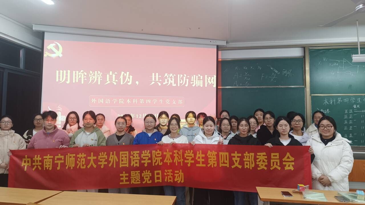 为了切实提高每一位同学对诈骗的警觉性与防范能力,2024年12月10日晚,必威西汉姆联官网本科第四学生党支部在实验楼2C-302教室举办了以“明眸辨真伪,共筑防骗网”为主题的党日活动。