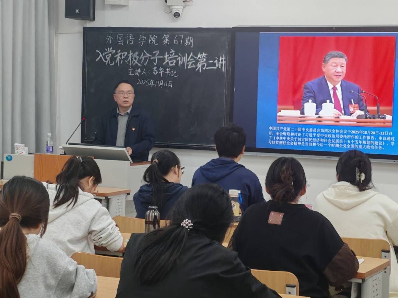 随后,苏华书记提出要注重党史学习教育,并让积极分子们要缅怀党的先烈前辈,积极学习党的历程和伟大成就。接着更加细致讲述了“红船精神”“古田精神”“遵义会议精神”“抗疫精神”等,让积极分子们更加深刻领悟到什么是精神谱系。此外,苏华书记还进一步解读了党的二十届四中全会精神,系统把握“十五五”的重点任务部署,强调了党总揽全局、协调各方的领导核心作用,在党的领导下,我国在教育、科技发展、农业农村现代化、社会主义文化建设、公共服务等领域取得显著成效,强调学习好贯彻好全会精神是当前和今后一个时期全党全国的重大任务。