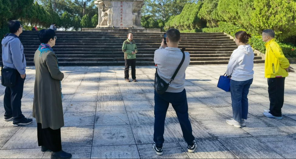 唐旭光老师重点介绍了坐落于公园内的狮子山革命烈士纪念碑。这座纪念碑建成于1994年,碑身庄重镌刻着337位烈士的英名,每一个名字背后,都承载着一段感人至深的革命记忆。纪念碑的设立,是为了纪念自20世纪20年代以来,在中国共产党的坚强领导下,武鸣县籍及不远千里奔赴武鸣县的共产党人、仁人志士,他们胸怀民族解放的崇高理想,心系人民幸福的深切期盼,主动投身革命事业,在艰难险阻中挺身而出,在枪林弹雨中奋勇前行,历经无数艰苦卓绝的斗争,用热血与生命践行了对党的忠诚,用牺牲与奉献诠释了初心使命,为国家独立、民族解放和人民幸福立下了不朽功勋。