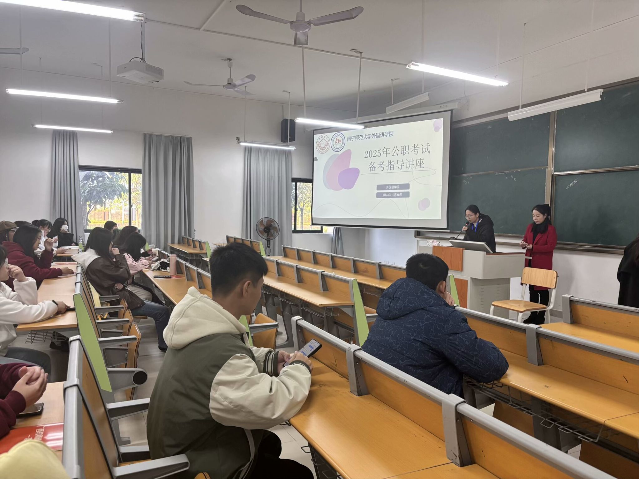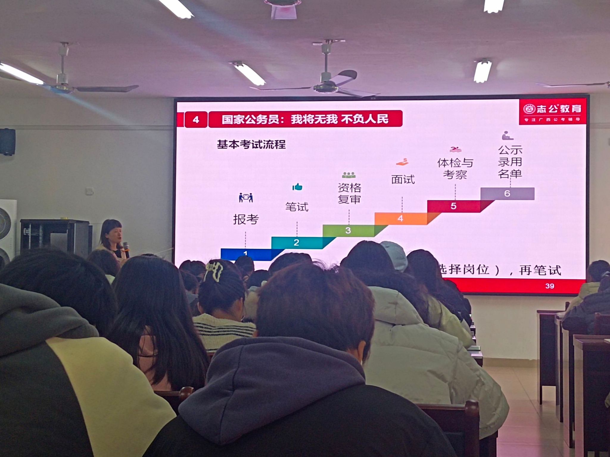 为帮助必威西汉姆联官网学生更好地备考公职考试,明确就业方向,并进一步做好职业生涯规划,我院于2024年12月18日在实验楼2-A102教室举办了以志公教育蒋梦媛老师为主讲的2025年广西公职考试备考指导讲座,并于12月20日在实验楼1-B515教室举办了以志公教育陈沙沙老师为主讲的大学生就业指导讲座。