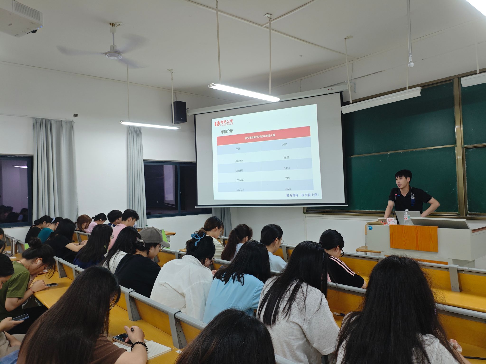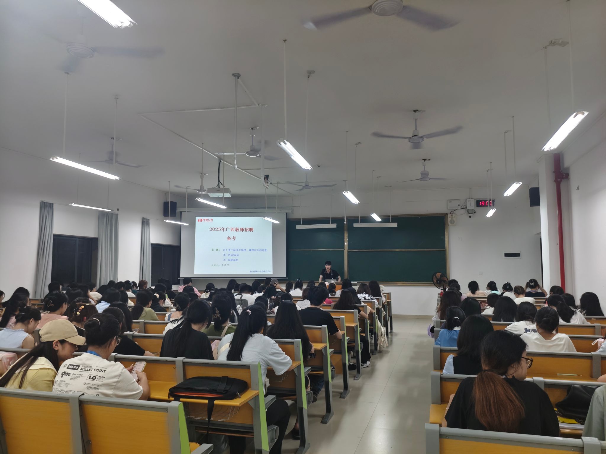 讲座现场座无虚席。老师凭借深厚的专业积累和丰富的实践经验,深入剖析当下教师招聘形势。他指出,教育部与人力资源社会保障部高度重视2025届高校毕业生就业工作,全国普通高校毕业生规模预计达1222万人,就业竞争空前激烈。同时,就国家拓宽就业政策进行详尽解读,涵盖扩大公职招聘人数和鼓励投身乡村振兴等方面,为同学们开阔就业思路。