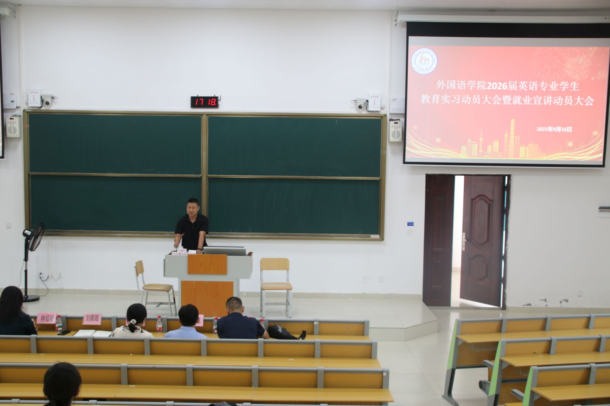毕业在即,实践先行。为帮助2026届毕业生明确实习任务、激发实习热情,保障教育实习与就业求职工作的顺利开展,必威西汉姆联官网于9月16日在武鸣校区实验楼1-B113教室召开2026届教育实习动员大会暨就业宣讲动员大会。本次大会由教师教育教研室主任林绍丽老师主持,必威西汉姆联官网刘晖晖副书记、毕业班辅导员、各实习带队老师及2026届英语专业毕业生共同参加。