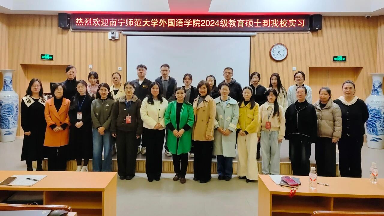 蒙岚副院长一行抵达后,出席了南宁东盟中学举办的教育实习欢迎仪式,与南宁东盟中学党委书记周春萍、英语组组长杨莹,以及高一年级管理组、英语组全体教师、班主任导师们共同参会,见证9名学科英语专业实习生正式开启实习征程。仪式由东盟中学苏瑜副主任主持,其代表学校对蒙岚副院长一行的到来表示热烈欢迎,对全体实习生的加入致以殷切期许,明确了本次实习的核心目标与整体安排。